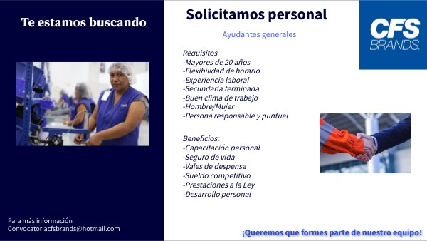 Requisitos -Mayores de 20 años -Flexibilidad de horario -Experiencia laboral -Secundaria terminada -Buen clima de trabajo -Hombre/Mujer -Persona responsable y puntual