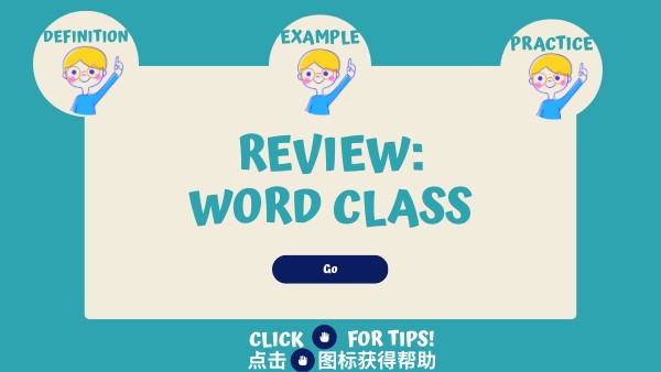 Verbs (动词): action or state words e.g. run, work, study, be, seem... Nouns (名词): words for people, places or things e.g. mother, Beijing, car, dog... Adjectives (形容词): words that describe nouns e.g. kind, clever, big, expensive... Adverbs (副词): words that modify verbs, adjectives or other adverbs. e.g. quickly, back, ever, badly...