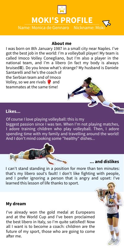 I was born on 8th January 1987 in a small city near Naples. I’ve got the best job in the world: I’m a volleyball player! My team is called Imoco Volley Conegliano, but I'm also a player in the national team, and I’m a libero (in fact my body is always bruised🥲). Do you know what’s strange? My husband is Daniele Santarelli and he’s the coach ofthe Serbian team and of Imoco Volley, so we are rivals 🥊 and teammates at the same time!