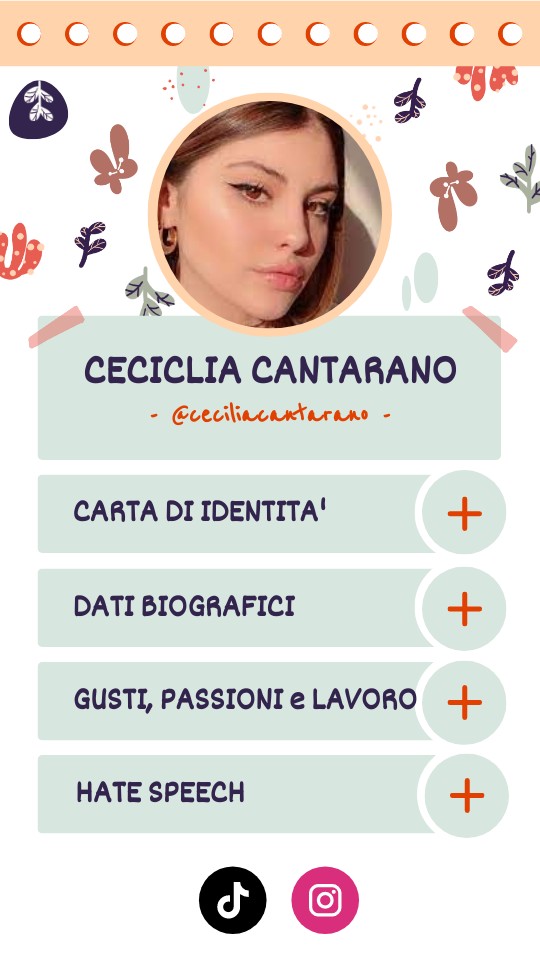 Cognome: Cantarano Nome: Cicilia Altezza: 166 cm Luogo e data di nascita: Roma. 27/03/2000 Sesso: F Cittadinanza: Ita Professione: Influencer Segno zodiacale: Ariete Profilo Instagram ufficiale: ceciliacantarano Profilo Tik Tok ufficiale: ceciliacantarano Diploma: Liceo Artistico "Giulio Carlo Argan" di Roma nel Luglio 2019 Single