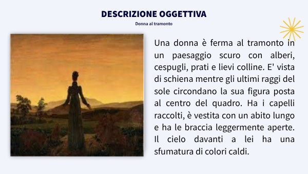 Questo quadro potrebbe intitolarsi "Un tramonto meraviglioso" perchè il gesto della donna, con le braccia sollevate davanti allo spettacolo del sole che sparisce dietro la collina, rende perfettamente tutto il suo stupore di fronte a quella scena. Anche senza vederla in volto possiamo immaginare che abbia gli occhi spalancati e un sorriso gioioso sul volto. Forse stava facendo una passeggiata ed è stata colta di sorpresa. Probabilmente è primavera, oppure autunno. Di sicuro, il paesaggio, anche se all'ombra, è coperto da prati verdi e la donna non ha un mantello per coprirsi. L'aria, perciò, deve essere tiepida. Tutto il dipinto è avvolto da una luce dorata che comunica un senso di gioia, pace e tranquillità.