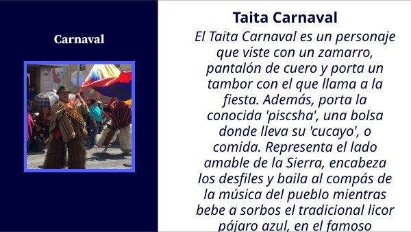 El Taita Carnaval es un personaje que viste con un zamarro, pantalón de cuero y porta un tambor con el que llama a la fiesta. Además, porta la conocida 'piscsha', una bolsa donde lleva su 'cucayo', o comida. Representa el lado amable de la Sierra, encabeza los desfiles y baila al compás de la música del pueblo mientras bebe a sorbos el tradicional licor pájaro azul, en el famoso Carnaval de Guaranda.