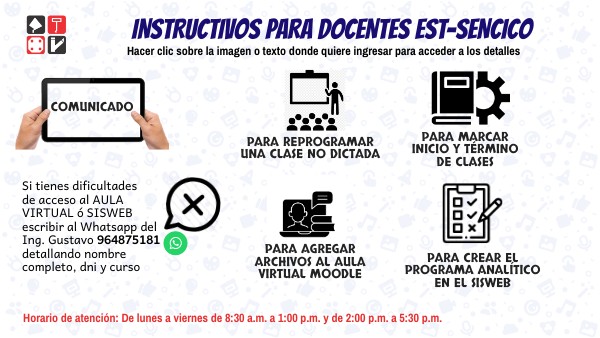 Estimados docentes de la EST Sencico Huancayo, al momento de ser parte de esta institución ustedes tienen acceso a: SISWEB https://sisweb.sencico.gob.pe/wsSisWeb/ Para acceder al curso, crear programa analítico, ver horarios, marcar asistencia y registro de notas de los alumnos AULA VIRTUAL https://virtual.sencico.gob.pe/ Para subir avisos, actividades, material de enseñanzas (archivo ppt, pdf, etc.) y evaluaciones CORREO INSTITUCIONAL https://outlook.office.com Para comunicación entre alumnos y personal de la Escuela de Sencico Huancayo MICROSOFT TEAMS https://teams.office.com/ Para crear salas virtuales en casos fortuitos de la no presencialidad educativa