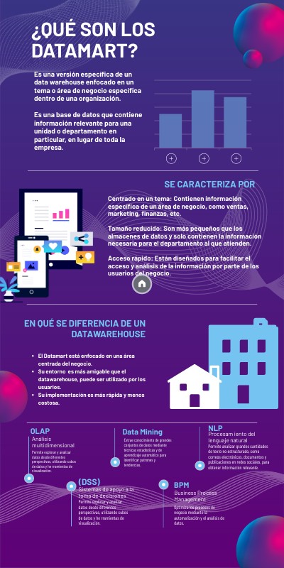 Es una versión específica de un data warehouse enfocado en un tema o área de negocio específica dentro de una organización. Es una base de datos que contiene información relevante para una unidad o departamento en particular, en lugar de toda la empresa.