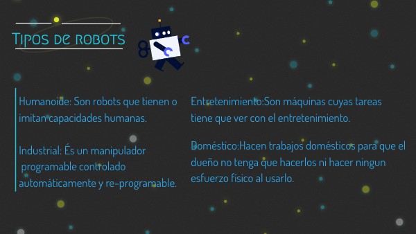Humanoide:Robot T-H3R de Toyotaes un robot de tercera generación que tiene capacidades que pueden ayudar a los humanos. Industrial:robot industrial de 6 ejes sus articulaciones pueden poner su mano en 3 formas diferentes.