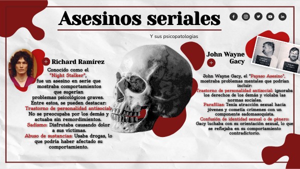 John Wayne Gacy, el "Payaso Asesino", mostraba problemas mentales que podrían incluir: Trastorno de personalidad antisocial: ignoraba los derechos de los demás y violaba las normas sociales. Parafilias: Tenía atracción sexual hacia jóvenes y cometía crímenes con un componente sadomasoquista. Confusión de identidad sexual o de género: Gacy luchaba con su orientación sexual, lo que se reflejaba en su comportamiento contradictorio.