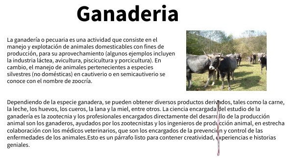 De acuerdo al tamaño de los animales que se crían, el ganado se clasifica en ganado mayor y ganado menor. La ganadería es una actividad económica primaria dedicada a la cría y explotación de ganado. La ganadería comprende varios tipos como: bovino, equino, ovino, caprino, porcino, leporino, así como aves y abejas.Esto es un párrafo listo para contener creatividad, experiencias e historias geniales.