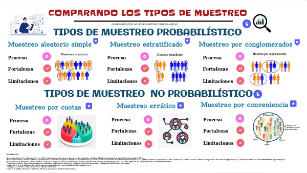 REFERENCIASHernández-Ávila, C. E., & Escobar, N. A. C. (2019). Introducción a los tipos de muestreo. Alerta, Revista científica del Instituto Nacional de Salud, 2(1 (enero-junio)), 75-79. Hernández González, Osvaldo. (2021). Aproximación a los distintos tipos de muestreo no probabilístico que existen. Revista Cubana de Medicina General Integral, 37(3), e1442. Epub 01 de septiembre de 2021. Recuperado en 08 de marzo de 2024, de http://scielo.sld.cu/scielo.php?script=sci_arttext&pid=S0864-21252021000300002&lng=es&tlng=es. Otzen, Tamara, & Manterola, Carlos. (2017). Técnicas de Muestreo sobre una Población a Estudio. International Journal of Morphology, 35(1), 227-232. https://dx.doi.org/10.4067/S0717-95022017000100037 Posada, G. J. (2010). Conceptos generales de estadística. En Elementos básicos de estadística descriptiva (pp. 11-21). Fundación Universitaria Luis Amigó. Velasco, M. L. Y. P., & Martínez, M. (2017). Muestreo probabilístico y no probabilístico. Licenciatura en, 3. Velázquez, A. P. (2017). Tipos de muestreo. México: Centrogeo. Vivanco, M. (2005). Muestreo estadístico. Diseño y aplicaciones. Editorial universitaria.