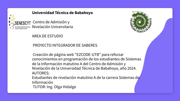 Universidad Técnica de Babahoyo Centro de Admisión y Nivelación Universitaria AREA DE ESTUDIO PROYECTO INTEGRADOR DE SABERES Creación de página web "EZCODE-UTB" para reforzar conocimientos en programación de los estudiantes de Sistemas de la Información matutino A del Centro de Admisión y Nivelación de la Universidad Técnica de Babahoyo, año 2024. AUTORES: Estudiantes de nivelación matutino A de la carrera Sistemas de Información TUTOR: Ing. Olga Hidalgo