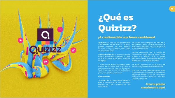 Quizizz es una web que nos permite crear cuestionarios online que los alumnos pueden responder de tres maneras distintas: en un juego directo, como tarea, de manera individual. ¿Cómo funciona? No es necesario instalar ninguna app de móvil, ordenador o Tablet ya que se puede jugar desde cualquier navegador. A diferencia de otras herramientas como Kahoot, no necesitas mirar al pizarrón o proyector de la clase, sino que la pregunta aparece en cada uno de los dispositivos junto a sus posibles respuestas. Características Se puede crear un conjunto de “memes” o dibujos personalizados que aparezcan después de cada respuesta de los participantes.