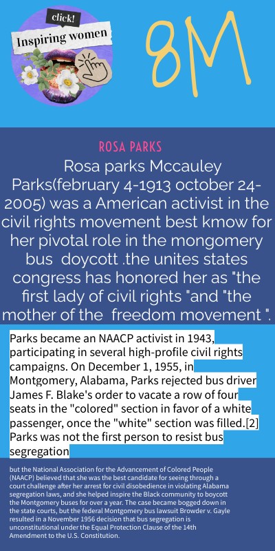 Rosa parks Mccauley Parks(february 4-1913 october 24-2005) was a American activist in the civil rights movement best kmow for her pivotal role in the mongomery bus doycott .the unites states congress has honored her as "the first lady of civil rights "and "the mother of the freedom movement ".