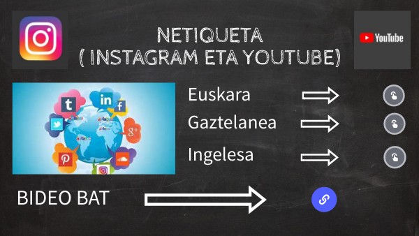 Instagram - Ez igo besteen gauzak - Beste batzuenak diren gauzak igotzen badituzu, haien baimenarekin - Ez egin kasu arraroak diren mezuei - Kontuz hitz egiten duzun jendearekin - Inoiz ez eman datu pribatuak inori zure familiako pertsonei izan ezik Youtube: - Ez egin besteen itxurak - Kontuz zer bilatzen duzun - Ez zaitezte engainatu esaten dutenarekin - Ez idatzi ezer txarrik inori (ez egin gorrotoa) - Ez egin kasu iruzkin txarrei bideoak igotzen badituzu