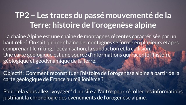 La chaîne Alpine est une chaîne de montagnes récentes caractérisée par un haut relief. On sait qu’une chaîne de montagnes se forme en plusieurs étapes comprenant le rifting, l’océanisation, la subduction et la collision. Une carte géologique est une source d’informations qui raconte l’histoire géologique et géodynamique de la Terre. Objectif : Comment reconstituer l’histoire de l’orogenèse alpine à partir de la carte géologique de France au millionième ? Pour cela vous allez "voyager" d'un site à l'autre pour récolter les informations justifiant la chronologie des évênements de l'orogenèse alpine. .