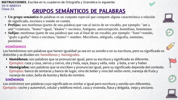 INSTRUCCIONES. Escribe en tu cuaderno de Ortografía y Gramática lo siguiente: VII-X-MMXXV Clase 23.