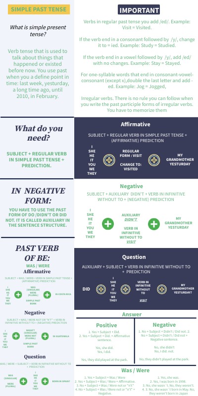 Verbs in regular past tense you add /ed/. Example: Visit = Visited. If the verb end in a consonant followed by /y/, change it to = ied. Example: Study = Studied. If the verb end in a vowel followed by /y/, add /ed/ with no changes. Example: Stay = Stayed. For one-syllable words that end in consonant-vowel-consonant (except x),double the last letter and add -ed. Example: Jog = Jogged, Irregular verbs. There is no rule you can follow when you write the past participle forms of irregular verbs. You have to memorize them