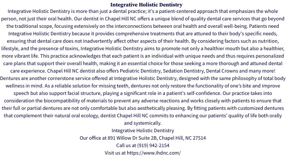 Integrative Holistic Dentistry is more than just a dental practice; it's a patient-centered approach that emphasizes the whole person, not just their oral health. Our dentist in Chapel Hill NC offers a unique blend of quality dental care services that go beyond the traditional scope, focusing extensively on the interconnections between oral health and overall well-being. Patients need Integrative Holistic Dentistry because it provides comprehensive treatments that are attuned to their body's specific needs, ensuring that dental care does not inadvertently affect other aspects of their health. By considering factors such as nutrition, lifestyle, and the presence of toxins, Integrative Holistic Dentistry aims to promote not only a healthier mouth but also a healthier, more vibrant life. This practice acknowledges that each patient is an individual with unique needs and thus requires personalized care plans that support their overall health, making it an essential choice for those seeking a more thorough and attuned dental care experience. Chapel Hill NC dentist also offers Pediatric Dentistry, Sedation Dentistry, Dental Crowns and many more! Dentures are another cornerstone service offered at Integrative Holistic Dentistry, designed with the same philosophy of total body wellness in mind. As a reliable solution for missing teeth, dentures not only restore the functionality of one’s bite and improve speech but also support facial structure, playing a significant role in a patient's self-confidence. Our practice takes into consideration the biocompatibility of materials to prevent any adverse reactions and works closely with patients to ensure that their full or partial dentures are not only comfortable but also aesthetically pleasing. By fitting patients with customized dentures that complement their natural oral ecology, dentist Chapel Hill NC commits to enhancing our patients' quality of life both orally and systemically. Integrative Holistic Dentistry Our office at 891 Willow Dr Suite 2B, Chapel Hill, NC 27514 Call us at (919) 942-2154 Visit us at https://www.ihdnc.com/