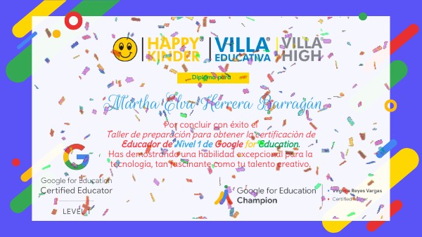 Por concluir con éxito elTaller de preparación para obtener la certificaciòn de Educador de Nivel 1 de Google for Education.Has demostrando una habilidad excepcional para la tecnología, tan fascinante como tu talento creativo.