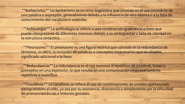 **Barbarismo:** Un barbarismo es un error lingüístico que consiste en el uso incorrecto de una palabra o expresión, generalmente debido a la influencia de otro idioma o a la falta de conocimiento del vocabulario estándar. - **Anfibología:** La anfibología se refiere a una construcción gramatical o frase que puede interpretarse de diferentes maneras debido a su ambigüedad o falta de claridad en la estructura sintáctica. - **Pleonasmo:** El pleonasmo es una figura retórica que consiste en la redundancia de términos, es decir, la inclusión de palabras o conceptos innecesarios que no añaden significado adicional a la frase. - **Redundancia:** La redundancia es el uso excesivo o repetitivo de palabras, frases o conceptos en una expresión, lo que resulta en una comunicación innecesariamente repetitiva o superflua. - **Cacofonía:** La cacofonía se refiere al uso de combinaciones de sonidos que resultan desagradables al oído, ya sea por su asonancia, disonancia o simplemente por la dificultad de pronunciación.ias e historias geniales.