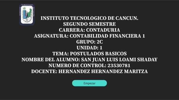 INSTITUTO TECNOLOGICO DE CANCUN. SEGUNDO SEMESTRE CARRERA: CONTADURIA ASIGNATURA: CONTABILIDAD FINANCIERA 1 GRUPO: 2C UNIDAD: 1 TEMA: POSTULADOS BASICOS NOMBRE DEL ALUMNO: SAN JUAN LUIS LOAMI SHADAY NUMERO DE CONTROL: 23530781 DOCENTE: HERNANDEZ HERNANDEZ MARITZA