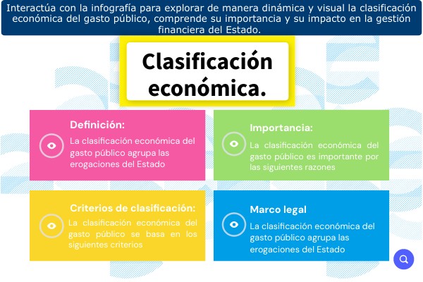 Interactúa con la infografía para explorar de manera dinámica y visual la clasificación económica del gasto público, comprende su importancia y su impacto en la gestión financiera del Estado.