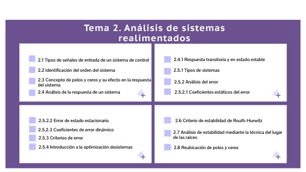 Error de estado estacionario: Es el error que se produce cuando el sistema alcanza un estado estable y la salida no coincide exactamente con el valor deseado. El error de estado estacionario se clasifica en función de la entrada aplicada al sistema: