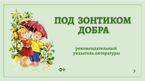 Дорогие ребята и уважаемые взрослые! Представляем вашему вниманию библиографический указатель литературы "Под зонтиком добра". На его страницах рекомендовано более двухсот книг любимых читателями разных поколений, а также книги современных авторов. В указателе два раздела: "Добро творит чудеса" и "Приди на помощь, друг!", внутри которых книги расположены в алфавите авторов. Кроме библиографического описания, обложки и аннотации имеются ссылки на полные тексты произведений. Вспомогательные указатели, представленные в приложении, помогут лучше ориентироваться. Авторы рекомендательного указателя – библиотекари из России и Казахстана, знакомят вас с хорошими книгами, в которых литературные примеры всегда воодушевляют и придают силы, вселяют уверенность в том, что каждый человек может творить добро, изменяя этот мир к лучшему.