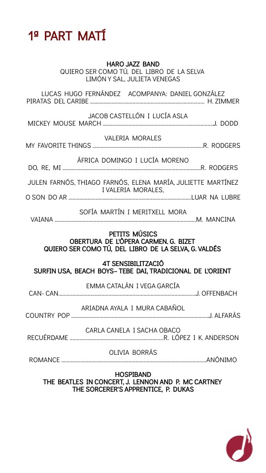 HARO JAZZ BAND Quiero ser como tú, Del libro de la selva Limón y sal, Julieta Venegas LUCAS HUGO FERNÁNDEZ ACOMPANYA: Daniel González Piratas del Caribe …………………….…........................………………..........… H. Zimmer JACOB CASTELLÓN I LUCÍA ASLAMickey Mouse March ……………………………..............................…….…….…J. Dodd VALERIA MORALES My favorite Things ……………………....................……….….................…...R. Rodgers ÁFRICA DOMINGO I LUCÍA MORENO Do, re, mi ………........…….....................…………………………….......................R. Rodgers JULEN FARNÓS, THIAGO FARNÓS, ELENA MARÍA, JULIETTE MARTÍNEZ I VALERIA MORALES, O Son do Ar ..………………..……………………....................................…….Luar na Lubre SOFÍA MARTÍN i MERITXELL MORA Vaiana .....................................................................................................M. Mancina PETITS MÚSICS Obertura de l'òpera Carmen, G. Bizet Quiero ser como tú, del libro de la selva, G. Valdés 4t SENSIBILITZACIÓ Surfin USA, Beach Boys– Tebe Dai, tradicional de l'Orient EMMA CATALÁN I VEGA GARCÍA Can- can..................................................................................................J. Offenbach ARIADNA AYALA I MURA CABAÑOL Country pop ..................................................................................................J. Alfaràs CARLA CANELA I SACHA OBACO Recuérdame ...................................................................R. López i K. Anderson OLIVIA BORRÁS Romance …………..……………......……………...........................………...........…..…Anónimo HOSPIBAND The Beatles in concert, J. Lennon and P. Mc Cartney The sorcerer's Apprentice, P. Dukas