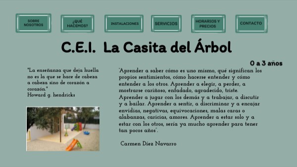 "La Casita del árbol es un centro educativo hecho a la carta. Cumple con todos los requisitos que tanto educación, bienestar social y el ayuntamiento imponen. Ha sido creada en un entorno rural, rodeado de naturaleza. Con la calidez de un hogar y la organización de un centro educativo.