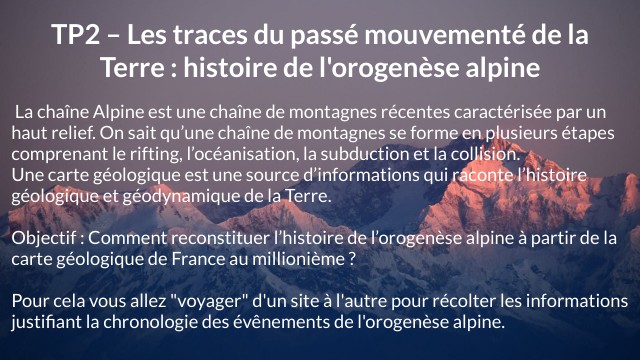 La chaîne Alpine est une chaîne de montagnes récentes caractérisée par un haut relief. On sait qu’une chaîne de montagnes se forme en plusieurs étapes comprenant le rifting, l’océanisation, la subduction et la collision. Une carte géologique est une source d’informations qui raconte l’histoire géologique et géodynamique de la Terre. Objectif : Comment reconstituer l’histoire de l’orogenèse alpine à partir de la carte géologique de France au millionième ? Pour cela vous allez "voyager" d'un site à l'autre pour récolter les informations justifiant la chronologie des évênements de l'orogenèse alpine. .