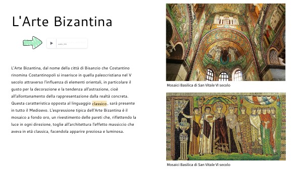 L'Arte Bizantina, dal nome della città di Bisanzio che Costantino rinomina Costantinopoli si inserisce in quella paleocristiana nel V secolo attraverso l'influenza di elementi orientali, in particolare il gusto per la decorazione e la tendenza all'astrazione, cioè all'allontanamento della rappresentazione dalla realtà concreta. Questa caratteristica opposta al linguaggio , sarà presente in tutto il Medioevo. L'espressione tipica dell'Arte Bizantina è il mosaico a fondo oro, un rivestimento delle pareti che, riflettendo la luce in ogni direzione, toglie all'architettura l'effetto massiccio che aveva in età classica, facendola apparire preziosa e luminosa.