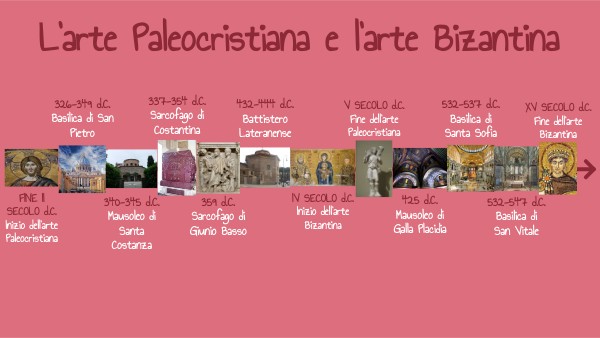 Periodo storico: Tra la fine del II secolo d.C. e il V secolo d.C. . Luoghi: Territori dell'Impero romano; l'Impero romano d'Occidente. Storia: I principali eventi storici che caratterizzano questi secoli sono:- la perdita dell’unità dell'impero con la divisione in Impero romano d'Oriente e Impero romano d'Occidente, iniziata dall'instaurazione della tetrarchia da parte di Diocleziano e sancita nel 395;- la proclamazione dell’editto di Milano, che pone fine alle persecuzioni cristiane, nel 313 d.C. da parte dell’imperatore Costantino;- lo spostamento della capitale dell’Impero d’Oriente a Bisanzio, ribattezzata Costantinopoli, messo in atto da Costantino nel 330;- la caduta dell'Impero romano d'Occidente nel 476 per mano del re germanico Odoacre, che fa uccidere l’ultimo imperatore Romolo Augustolo. Arte: L'arte romana è alle sue ultime manifestazioni, si parla quindi di arte tardo romana, mentre per il cristianesimo è l’arte più antica, perciò si parla di arte paleocristiana.Il periodo tardoantico rappresentaun fondamentale anello di congiunzione tra l'epoca romano-classica e il Medioevo. - In architettura l'arte tardo romana si caratterizza per l'accentuazione della monumentalità, mentre quella paleocristiana per l'attribuzione di un forte simbolismo religioso ai principali modelli romani di pianta longitudinale e centrale.- Nella scultura perde importanza la realizzazione di sculture a tutto tondo a favore del rilievo, le cui figure scolpite sono disposte frontalmente e tra loro slegate.- In pittura si diffonde la tecnica del mosaico per decorare ambienti privati o edifici di culto, la rappresentazione viene semplificata e caricata di significati simbolici di carattere religioso.