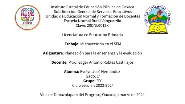 Instituto Estatal de Educación Pública de Oaxaca Subdirección General de Servicios Educativos Unidad de Educación Normal y Formación de Docentes Escuela Normal Rural Vanguardia Clave: 20DNL0012X Licenciatura en Educación Primaria Trabajo: Mi trayectoria en el SEM Asignatura: Planeación para la enseñanza y la evaluación Docente: Mtro. Edgar Antonio Robles Castillejos Alumna: Evelyn José Hernández Gado: 1° Grupo: "D" Ciclo escolar: 2023-2024 Villa de Tamazulapam del Progreso, Oaxaca, a marzo de 2024.