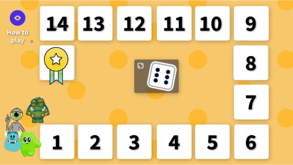 1) Divide the class into four teams 2) Each team picks a monster to use as a pawn 3) In turns, the teams roll the dice and move along the path. 4) Every time a pawn lands on a box, the players must click on the number to open the question 5) The players must click on the monster icon to pick a monster and then they describe it (e.g. it is blue, it's got two big eyes and three teeth)