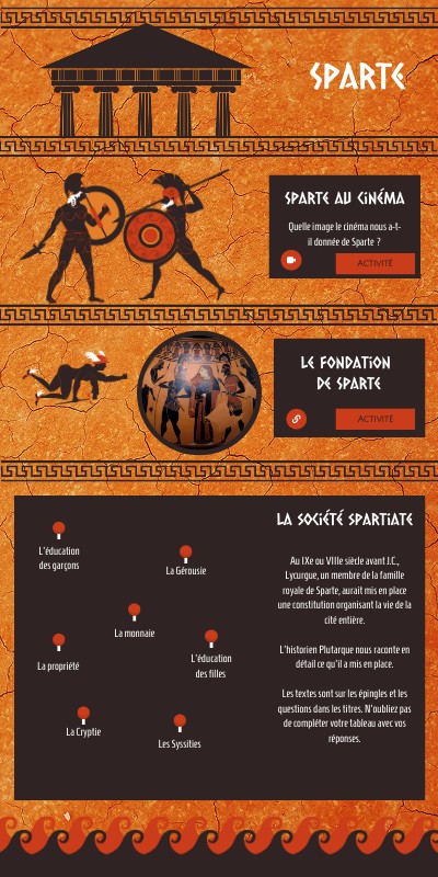 Au IXe ou VIIIe siècle avant J.C., Lycurgue, un membre de la famille royale de Sparte, aurait mis en place une constitution organisant la vie de la cité entière. L'historien Plutarque nous raconte en détail ce qu'il a mis en place. Les textes sont sur les épingles et les questions dans les titres. N'oubliez pas de compléter votre tableau avec vos réponses.