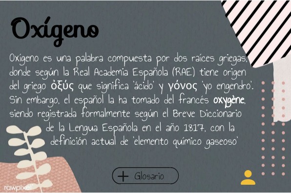 Oxígeno es una palabra compuesta por dos raíces griegas, donde según la Real Academia Española (RAE) tiene origen del griego ὀξύς que significa 'ácido' y γόνος 'yo engendro'. Sin embargo, el español la ha tomado del francés oxygène, siendo registrada formalmente según el Breve Diccionario de la Lengua Española en el año 1817, con la definición actual de 'elemento químico gaseoso'