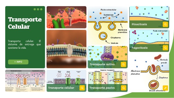 El "Transporte celular", se trata de un conjunto de mecanismos que, las células utilizan para mover sustancias a través de su membrana plasmática, permitiendo el intercambio de materiales entre el interior y exterior de la célula. El "Transporte celular", es fundamental para mantener las condiciones internas necesarias para la vida celular. Características: 1. Incluye tanto mecanismos pasivos como activos. 2. Puede requerir el uso de energía (ATP) en algunos casos. 3. Esencial para el mantenimiento del equilibrio homeostático. 4. Se realiza a través de la membrana plasmática o mediante vesículas. 5. Implica el movimiento de iones, moléculas orgánicas y otras partículas.