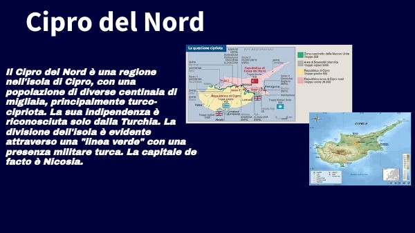 Il Cipro del Nord è una regione nell'isola di Cipro, con una popolazione di diverse centinaia di migliaia, principalmente turco-cipriota. La sua indipendenza è riconosciuta solo dalla Turchia. La divisione dell'isola è evidente attraverso una "linea verde" con una presenza militare turca. La capitale de facto è Nicosia.