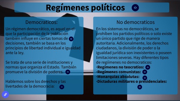 Un régimen democrático, es aquel en el que la participación de la población también influye en ciertas tomas de decisiones, también se basa en los principios de libertad individual e igualdad ante la ley. Se trata de una serie de instituciones y normas que organiza el Estado. También promueve la división de poderes. Hablemos sobre los derechos y las livertades de la democracia: