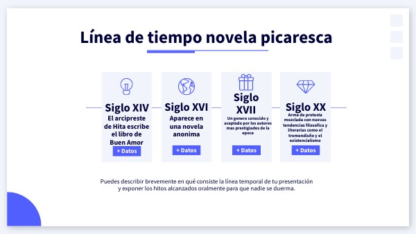 Puedes describir brevemente en qué consiste la línea temporal de tu presentación y exponer los hitos alcanzados oralmente para que nadie se duerma.