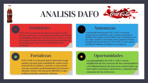 COCA-GOLA es unas de las marcas de refrecos cuyo precio es más alto, es considerada una marca de bebida no saludable por lo que esto afecta a su ventas y es una marca que no suele sacar al mercado nuevosproductos al mercado por lo que no hay diverdiadad en los productos.