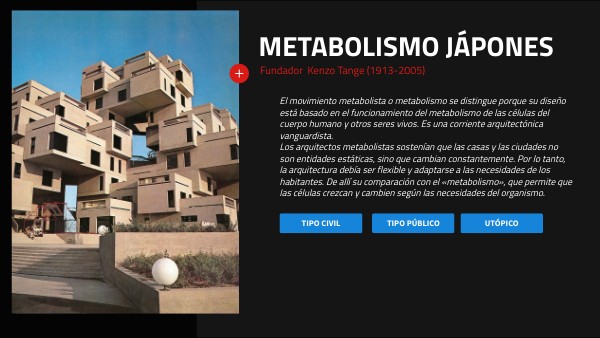 El movimiento metabolista o metabolismo se distingue porque su diseño está basado en el funcionamiento del metabolismo de las células del cuerpo humano y otros seres vivos. Es una corriente arquitectónica vanguardista.Los arquitectos metabolistas sostenían que las casas y las ciudades no son entidades estáticas, sino que cambian constantemente. Por lo tanto, la arquitectura debía ser flexible y adaptarse a las necesidades de los habitantes. De allí su comparación con el «metabolismo», que permite que las células crezcan y cambien según las necesidades del organismo.