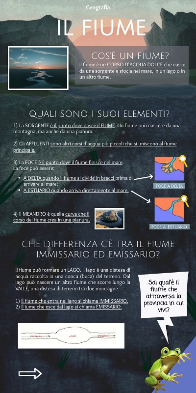 1) La SORGENTE è il punto dove nasce il FIUME. Un fiume può nascere da una montagna, ma anche da una pianura. 2) Gli AFFLUENTI sono altri corsi d'acqua più piccoli che si uniscono al fiume principale. 3) La FOCE è il punto dove il fiume finisce nel mare. La foce può essere: