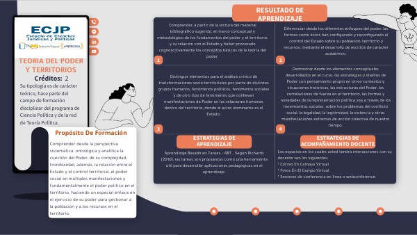 Comprender desde la perspectiva sistemática, ontológica y analítica la cuestión del Poder, de su complejidad, frondosidad, además, la relación entre el Estado y el control territorial, el poder social en múltiples manifestaciones y fundamentalmente el poder político en el territorio, haciendo un especial énfasis en el ejercicio de su poder para gestionar a la población y a los recursos en el territorio.