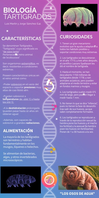 Se denominan Tartígrados, "Tartígrado", cuyo significado es "de paso lento" Pertenecen al reino animal de"ecdisozoos". Son organismos extremófilos, es decir, resistentes a condiciones extremas. Poseen características únicas en el reino animal como: -Poder sobrevivir en el vacío del espacio o soportar presiones muy altas de casi 6000 atm. -Pueden sobrevivir a temperaturas de -200 °C y hasta los 150 °C. -A la deshidratación prolongada (pueden pasar hasta 10 años sin obtener agua) -Además, son capaces de sobrevivir a grandes radiaciones.