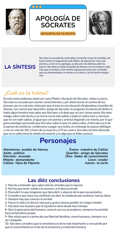 1- Nos da a entender que valen más las virtudes que la riqueza 2- No hay que tener miedo a la muerte y a lo descocnocido 3- Descubrir lo que tengamos que descubrir y alejarse de lo que nos perjudica 4- Considero que hace una similitud con dios, lo condenan por profanar nuevas ideas 5- Siempre hay que conocer la verdad 6- Hacer la vida y el alma lo más pura, grata y buena posible sin ningún miedo} 7- Sócrates nos muestra que la injusiticia viene desde hace tiempo 8- Que la ignorancia del humano, como lo son sus acusadores, siempres ha existido hacia el beneficio propio 9- Nos relata que el camino de una libertad idealista, como humanos, siempre va a ser castigada 10- Sócrates considera que la enseñansa es de lo más importante y concuerdo por que el conocimiento es fruto de la existencia y evolución humana