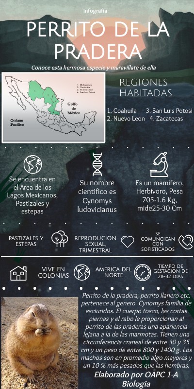 Perrito de la pradera, perrito llanero etc. pertenece al genero Cynomys familia de esciuridos. El cuerpo tosco, las cortas piernas y el rabo le proporcionan al perrito de las praderas una apariencia lejana a la de las marmotas. Tienen una circunferencia craneal de entre 30 y 35 cm y un peso de entre 800 y 1400 g. Los machos son en promedio algo mayores y un 10 % más pesados que las hembras.