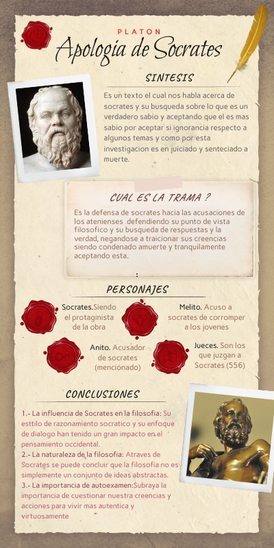 Es la defensa de socrates hacia las acusaciones de los atenienses defendiendo su punto de vista filosofico y su busqueda de respuestas y la verdad, negandose a traicionar sus creencias siendo condenado amuerte y tranquilamente aceptando esta.