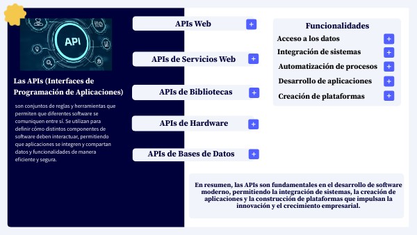 En resumen, las APIs son fundamentales en el desarrollo de software moderno, permitiendo la integración de sistemas, la creación de aplicaciones y la construcción de plataformas que impulsan la innovación y el crecimiento empresarial.