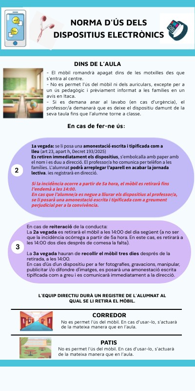 - No es permet l’ús del mòbil ni dels auriculars, excepte per a un ús pedagògic i prèviament informat a les famílies en un avís en Itaca.