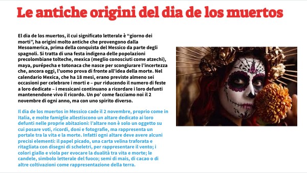 El dia de los muertos, il cui significato letterale è “giorno dei morti”, ha origini molto antiche che provengono dalla Mesoamerica, prima della conquista del Messico da parte degli spagnoli. Si tratta di una festa indigena delle popolazioni precolombiane tolteche, mexica (meglio conosciuti come atzechi), maya, purépecha e totonaca che nasce per scongiurare l’incertezza che, ancora oggi, l’uomo prova di fronte all’idea della morte. Nel calendario Mexica, che ha 18 mesi, erano previste almeno sei occasioni per celebrare i morti e – pur riducendo il numero di feste a loro dedicate – i messicani continuano a ricordare i loro defunti mantenendone vivo il ricordo. Un po’ come facciamo noi il 2 novembre di ogni anno, ma con uno spirito diverso.